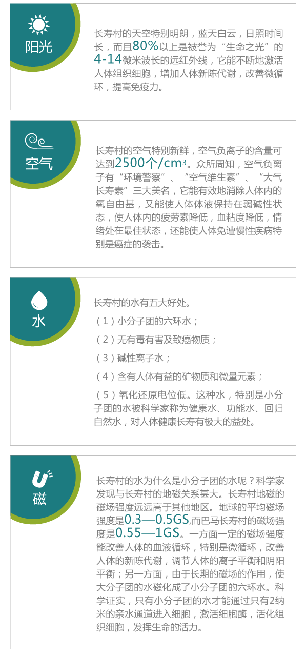 總之,長壽村的陽光好、空氣好、水好、磁更好,人類賴以生存的四大要素?zé)o一不佳,借用莊子的話說,長壽村的人占據(jù)了“天、地、人合一,人渾一于自然”的佳境。我們現(xiàn)在所處的環(huán)境比起長壽村來說,可謂天壤之別,長壽村的人健康長壽則是天經(jīng)地義的!
