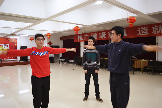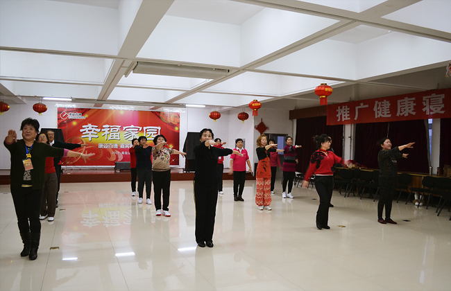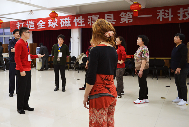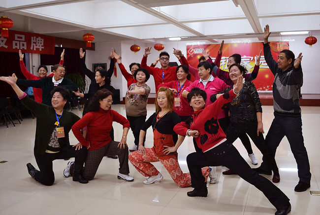 最早趕到康姿百德公司排練場地的是16位伴舞人員,都是50歲以上的中老年人。她們從早晨8點半開始便投入了一遍又遍地排練。每排練一遍,舞蹈老師都會進行細微的糾正、調整隊形和調動情緒。每位健身操隊員也沒有因為反復的走位表現(xiàn)出疲憊或煩躁,始終面帶笑容,激情勃勃的投入排練。因為投入的運動量非常大,很多人都是滿頭大汗,演員們就索性脫下厚實的棉衣輕裝上陣。