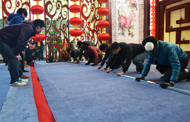 細(xì)節(jié)無(wú)處不在——志愿者悉心平整、粘合舞臺(tái)地毯