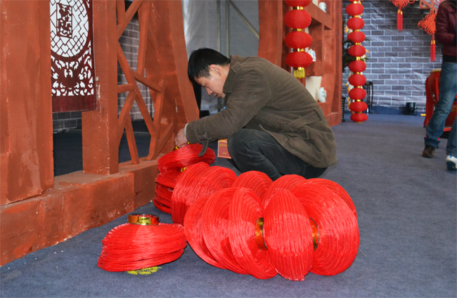 600個(gè)大紅燈籠高高掛——志愿者要經(jīng)過(guò)安燈、掛燈、試燈、調(diào)燈四個(gè)程序