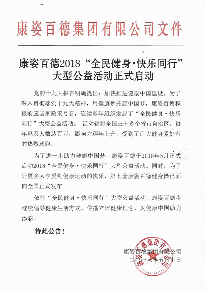 康姿百德2018“全民健身?快樂同行”大型公益活動正式啟動,公告全文如下: