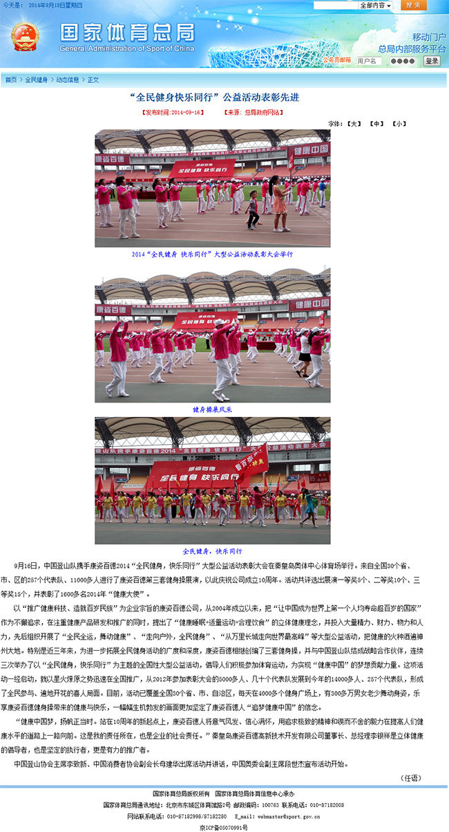 國家體育總局官網(wǎng)以《“全民健身快樂同行”公益活動表彰先進》為題,對中國登山隊攜手康姿百德2014“全民健身 快樂同行”大型公益活動表彰大會進行報道。