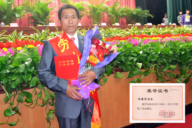 2012年4月24日,秦皇島市2009—2012年度市級勞動模范表彰暨慶?!拔逡弧眹H勞動節(jié)大會在秦皇島工人文化宮隆重召開??底税俚鹿局圃旌笄诓繖C(jī)電主管馮國成同志被授予“秦皇島市2009-2012年度職工勞動模范”榮譽(yù)稱號,并受到了秦皇島市市委、市政府各級領(lǐng)導(dǎo)的親切接見。