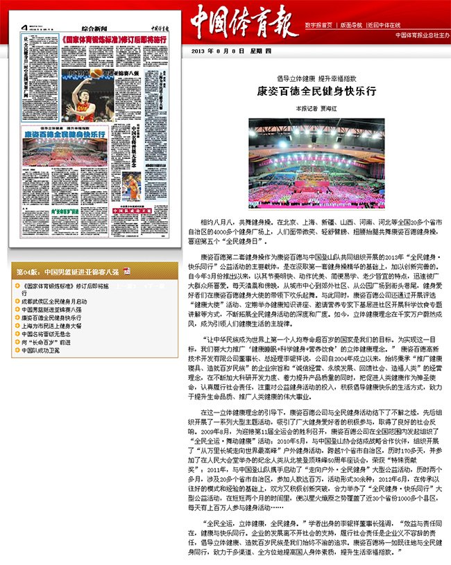 2013年8月8日,在第五個(gè)“全民健身日”到來(lái)之際,《中國(guó)體育報(bào)》以《倡導(dǎo)立體健康,提升幸福指數(shù)——康姿百德全民健身快樂(lè)行》為題,對(duì)康姿百德公司“全民健身·快樂(lè)同行”大型公益活動(dòng)進(jìn)行了專(zhuān)題報(bào)道。這是繼去年8月8日、今年3月9日之后,《中國(guó)體育報(bào)》第三次對(duì)康姿百德公司全民健身活動(dòng)進(jìn)行的專(zhuān)題報(bào)道。