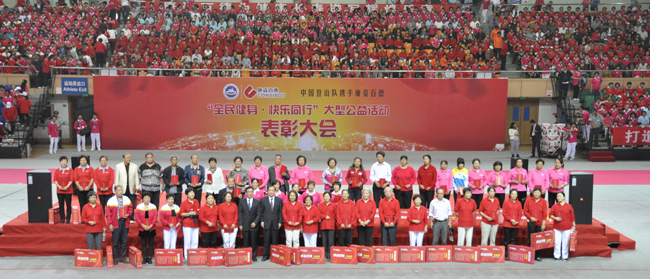 “全民健身 快樂同行”大型公益活動表彰大會在激昂的《歌唱祖國》的大合唱中圓滿閉幕??底税俚屡c來自全國的健身愛好者們共同譜寫了一曲快樂健身的不朽贊歌。