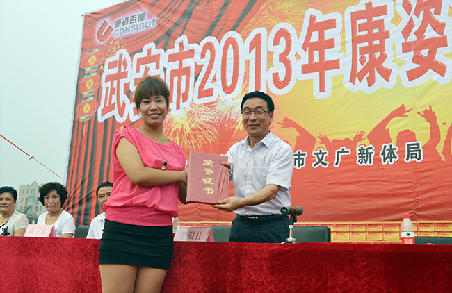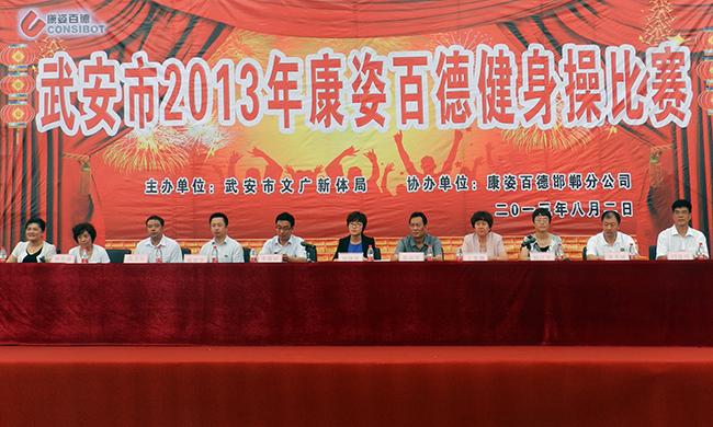 為迎接第五個(gè)“全民健身日”的到來,引導(dǎo)廣大群眾積極參加體育健身活動,武安市文廣新體局、康姿百德邯鄲分公司聯(lián)合在武安廣場舉行了康姿百德第二套健身操比賽。來自武安市各健身站點(diǎn)的24支代表隊(duì)共計(jì)658人參加了比賽,整個(gè)比賽精彩紛呈,高潮迭起,產(chǎn)生了良好的社會反響??底税俚鹿径麻L、總經(jīng)理李銀祥在百忙之中出席比賽并致辭。