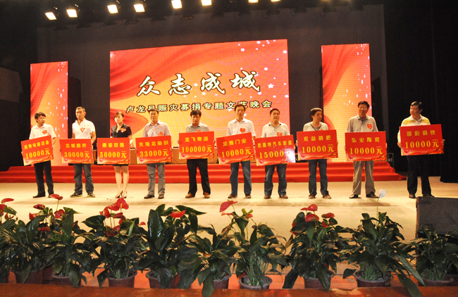 “眾志成城”――盧龍縣賑災(zāi)募捐專題文藝晚會(huì)捐贈(zèng)儀式(左三為康姿百德公司)