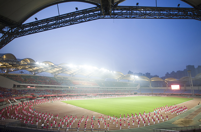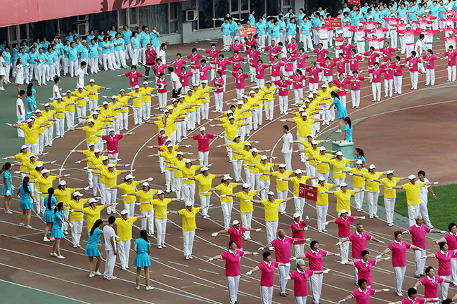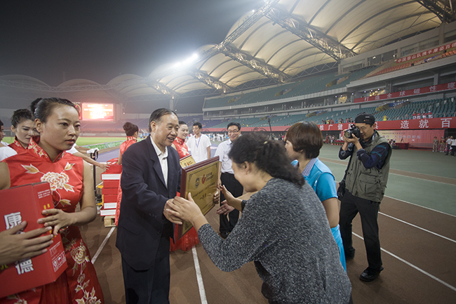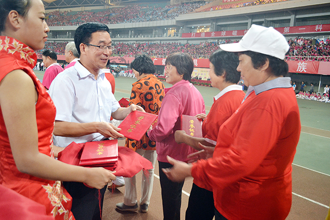 督導師進行紅旗表演 康姿百德健身操表演,是這次活動中檢閱和展示全民健身成果的重要內容,也是最為引人注目的重頭戲。20多個省、市、自治區(qū)的8000多名康姿百德健身操愛好者,組成188個代表隊先后入場,表演隊伍浩浩蕩蕩、首尾相連,偌大的體育場瞬時變成一個舞的海洋。參賽隊員中年齡最大的72歲,最小的只有9歲,大家雖然經(jīng)歷了長途跋涉的旅途勞頓,但個個精神飽滿、熱情高漲,橫平豎直、整齊優(yōu)美的表演,帶給全場觀眾以美的享受,向人們傳遞著積極向上、健康文明的生活方式,贏得了全場觀眾的陣陣掌聲。經(jīng)過6個多小時的精彩表演,在評委們公正認真的打分評判下,比賽共產(chǎn)生一等獎2個,二等獎6個,三等獎9個。