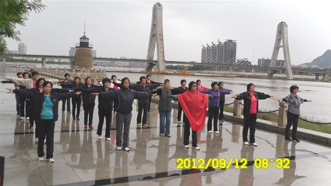 2012年9月12日,天空下著蒙蒙細(xì)雨,在遼寧朝陽大凌河畔照例響起了動感的音樂,伴隨著節(jié)奏,有這樣一群中老年人,時而胳膊上揚,時而屈腿下蹲,時而左右擺動,時而前后擊掌……他們在干什么?下雨天不是應(yīng)該躲在家里看看電視、搓搓麻將、打打撲克嗎?為什么他們卻冒雨在明快節(jié)奏中舞動…… 原來,這是一隊康姿百德健身操愛好者。近日,不管是炎炎烈日下,還是蒙蒙細(xì)雨中,都從不間斷練習(xí)。2012年8月8日《中國體育報》刊登了一則新聞,報道將于9月23日舉辦全國康姿百德健身操精彩展演活動。看到這則消息后,遼寧朝陽的康姿百德健身操愛好者們就踴躍報名,組建隊伍精心備戰(zhàn)。參賽者們不僅參加每天晚上集體的健身操活動,并且還要每天堅持2個小時的集訓(xùn)。在集訓(xùn)指導(dǎo)老師分解動作教學(xué)后,這些參賽者更是信心倍增。 9月12日,從夜間到清晨雨水不斷,但是上午8時,參賽者們卻依然頂著雨打著傘來到了訓(xùn)練場地,因為打傘練操不方便,阿姨們放下傘頂著雨一遍一遍的做著重復(fù)的動作,只為把每一個動作做得更好。只要音樂不停,即使雨再大,她們的動作也不會停止。隊員們有一個共同的信念:展示最美朝陽人。 對于參加這次健身操比賽,隊員們的態(tài)度都很積極,這是她們代表朝陽人第一次走出去,名次雖不重要,但要展現(xiàn)出朝陽人的風(fēng)采,展現(xiàn)出自己最好的一面。