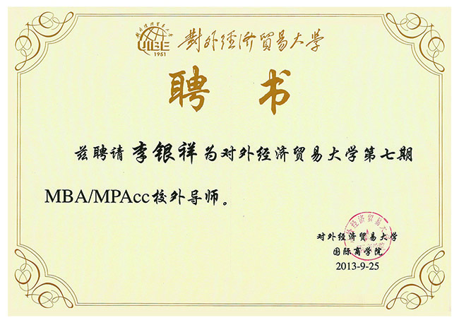 近日,我公司董事長、總經(jīng)理李銀祥被對外經(jīng)濟貿(mào)易大學聘任為第七期MBA/MPAcc校外導(dǎo)師。9月25日在北京舉行的聘任儀式上,李銀祥和其他聘任導(dǎo)師一起宣誓,承諾將肩負教育事業(yè)的責任與使命,認真履行一名教育者的義務(wù),無私奉獻、積極幫助那些懷揣激情的年輕人實現(xiàn)夢想。 據(jù)了解,“校外導(dǎo)師制度”是對外經(jīng)濟貿(mào)易大學著眼培養(yǎng)高素質(zhì)、復(fù)合型管理人才而推行的一項教育制度,主要聘請著名專家學者、知名企業(yè)家、政府官員等各界精英加盟,分享國內(nèi)外最新研究成果、討論企業(yè)管理熱點問題、交流先進的管理經(jīng)驗,為學生、學校、企業(yè)、政府打造信息交流的平臺。 李銀祥董事長被聘任為MBA/MPAcc校外導(dǎo)師,是學術(shù)界對我公司發(fā)展理念、管理水平的認可和肯定,對于公司進一步加強與高等院校的合作發(fā)展,培養(yǎng)引進高層次優(yōu)秀人才都將起到十分積極的作用。
