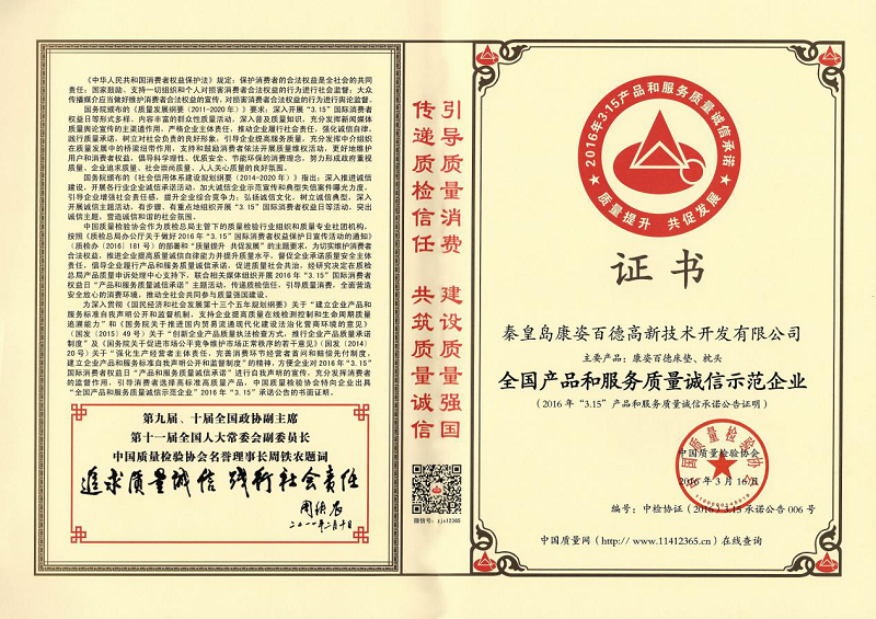 此外,康姿百德還分別榮獲3.15主題活動(dòng)中“全國(guó)產(chǎn)品和服務(wù)質(zhì)量誠(chéng)信示范企業(yè)”、“全國(guó)質(zhì)量檢驗(yàn)穩(wěn)定合格產(chǎn)品”兩項(xiàng)榮譽(yù)。