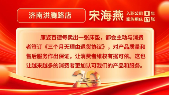 宋海燕表示,因為在康姿百德這樣一個講誠信、負(fù)責(zé)任的企業(yè)工作,讓廣大消費者都更加信任她,這讓宋海燕也非常自豪。她也表示,作為康姿百德的一員,今后,會以更加飽滿的熱情和責(zé)任心,全心全意地服務(wù)好每一位客戶,讓大家都能感受到她的真心和誠意。