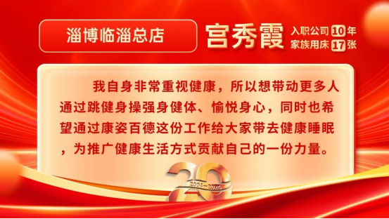 宮秀霞因康姿百德健身操與康姿百德結(jié)緣,入職后,了解到康姿百德是一家有社會責(zé)任感的公司,一直用實際行動推動著“健康中國”建設(shè)。