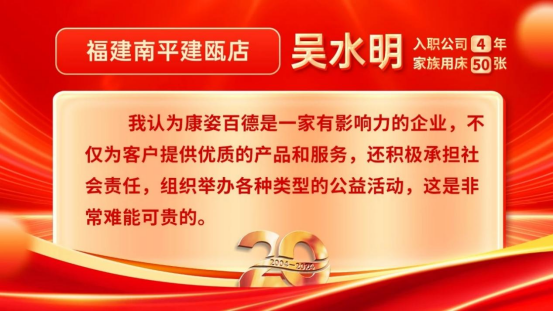 康姿百德20周年專賣店員工的系列故事會持續(xù)推出,讓我們一起期待其他地區(qū)專賣店員工代表的精彩故事吧!