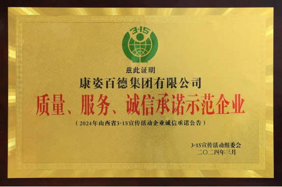 康姿百德被山西315宣傳活動組委會授予“質(zhì)量 服務(wù) 誠信承諾示范企業(yè)”榮譽稱號