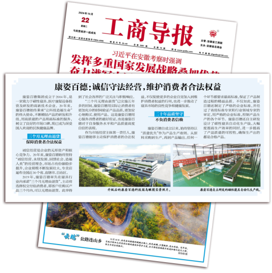 《工商導(dǎo)報》是安徽省工商聯(lián)主管,安徽省總商會主辦的面向全國公開發(fā)行的報刊?!豆ど虒?dǎo)報》以“康姿百德:誠信守法經(jīng)營,維護消費者合法權(quán)益”為題對康姿百德進行報道。