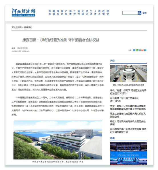 《河北經(jīng)濟日報》由河北日報報業(yè)集團主辦,是河北省委、省政府指導(dǎo)全省經(jīng)濟工作的重要輿論陣地。作為河北省優(yōu)秀企業(yè),康姿百德拉動了經(jīng)濟消費,對河北省乃至全國消費者權(quán)益保護起到了積極、深遠的影響。因在誠信經(jīng)營和消費者權(quán)益保護等方面取得的優(yōu)異成績,《河北經(jīng)濟日報》連續(xù)6年對康姿百德進行報道。