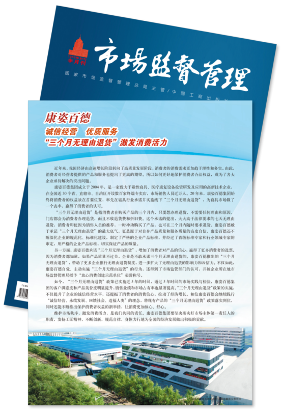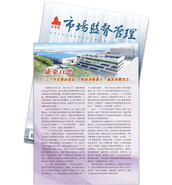今年12月,《市場監(jiān)督管理》半月刊專題報道再次以《康姿百德“三個月無理由退貨”--釋放消費潛力 激發(fā)消費活力》為題,全面、詳細地報道了康姿百德?!妒袌霰O(jiān)督管理》半月刊對康姿百德的多次專題報道,是對康姿百德的認可,也是激勵??底税俚聦⒁蝗缂韧貓猿终\信經(jīng)營,不斷提升產(chǎn)品和服務(wù)質(zhì)量,為寢具市場在保障消費者權(quán)益方面做出表率,帶動更多企業(yè)推行無理由退貨制度,為經(jīng)濟高質(zhì)量發(fā)展做出新的貢獻。