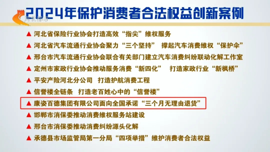 3月15日晚,河北廣播電視臺聯(lián)合河北省市場監(jiān)督管理局、河北省消費(fèi)者權(quán)益保護(hù)委員會、全國16省市電視臺推出的3·15特別節(jié)目中,河北省消費(fèi)者權(quán)益保護(hù)委員會秘書長 王守用現(xiàn)場宣布了2024年保護(hù)消費(fèi)者合法權(quán)益創(chuàng)新案例。康姿百德集團(tuán)有限公司面向全國承諾“三個月無理由退貨”,成功入選。