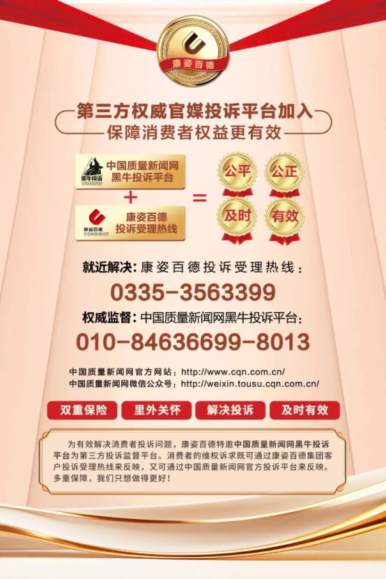 為了進(jìn)一步提升專賣店的服務(wù)水平,更好地保護(hù)消費(fèi)者的合法權(quán)益,康姿百德開通企業(yè)投訴受理熱線,加入了中國消費(fèi)者協(xié)會“智慧315”消費(fèi)維權(quán)投訴平臺,還特邀“中國質(zhì)量新聞網(wǎng)黑牛投訴平臺”作為第三方投訴監(jiān)督平臺。并且,統(tǒng)一制作監(jiān)督舉報(bào)公示牌張貼在全國所有門店,主動接受消費(fèi)者的監(jiān)督。多重途徑保障消費(fèi)者的合法權(quán)益,真正做到投訴有渠道,事事有回音,件件有著落,讓廣大消費(fèi)者購買無憂。